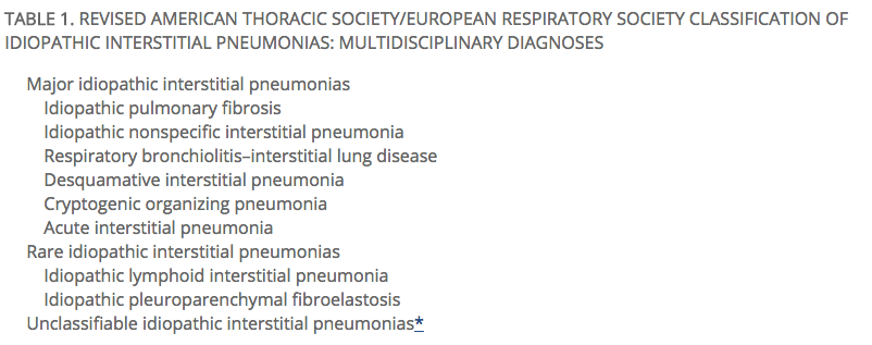 Within the group associated with a cause/exposure (HP) birds, then moulds are the most common causes in the UK. The ‘idiopathic’ group contains a number of distinct entities and is further sub-classified in the 2013 Revised ATS/ERS Statement: Update of the International Multidisciplinary Classification of the Idiopathic Interstitial Pneumonias: