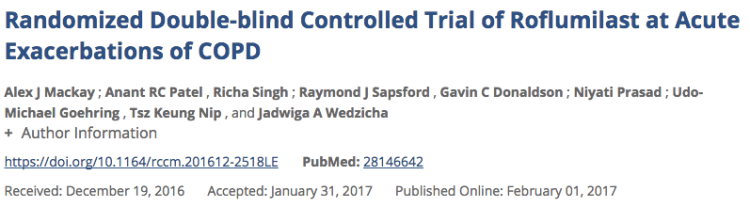 - Mackay, Alex J., et al. “Randomized Double-blind Controlled Trial of Roflumilast at Acute Exacerbations of COPD.” American Journal of Respiratory And Critical Care Medicine ja (2017).